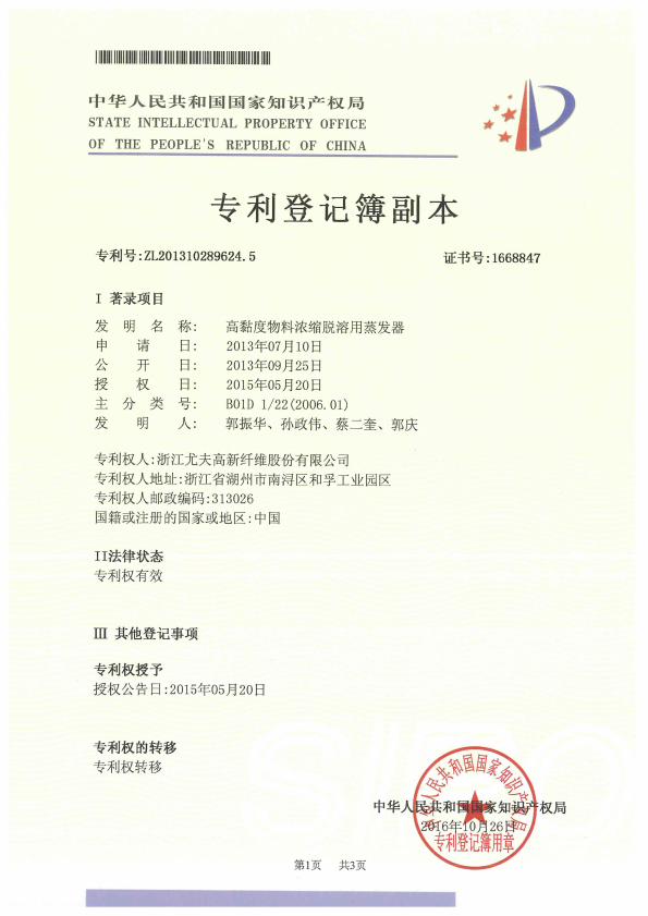 高黏度物料濃縮脫溶用蒸發(fā)器 受讓專(zhuān)利登記簿